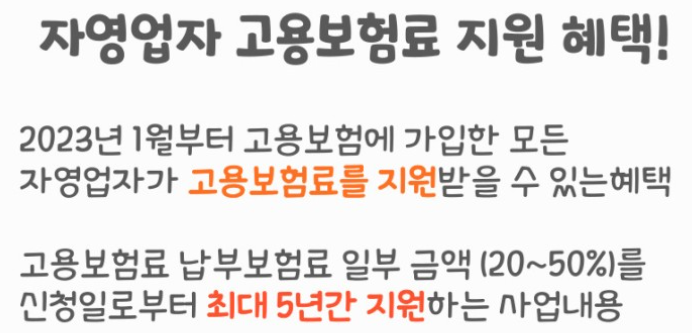 2023년 1월부터 고용보험에 가입한 모든 자영업자가 고용보험료를 지원받을 수 있는 혜택으로 고용보험료 납부보험료 일부 금액(20~50%)을 신청일로부터 최대 5년간 지원하는 사업내용입니다.