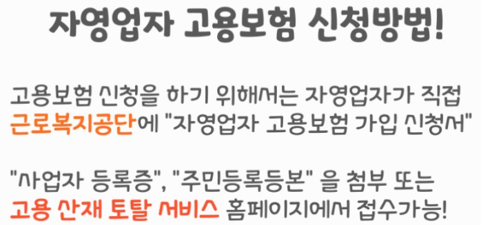 고용보험 신청을 하기 위해서는 자영업자가 직접근로복지공단에 "자영업자 고용보험 가입 신청서"에 사업자 등록증, 주민등록등본 등을 첨부하여근로복지공단에서 처리결과(승인, 불승인)에 대해 통지서로 통보